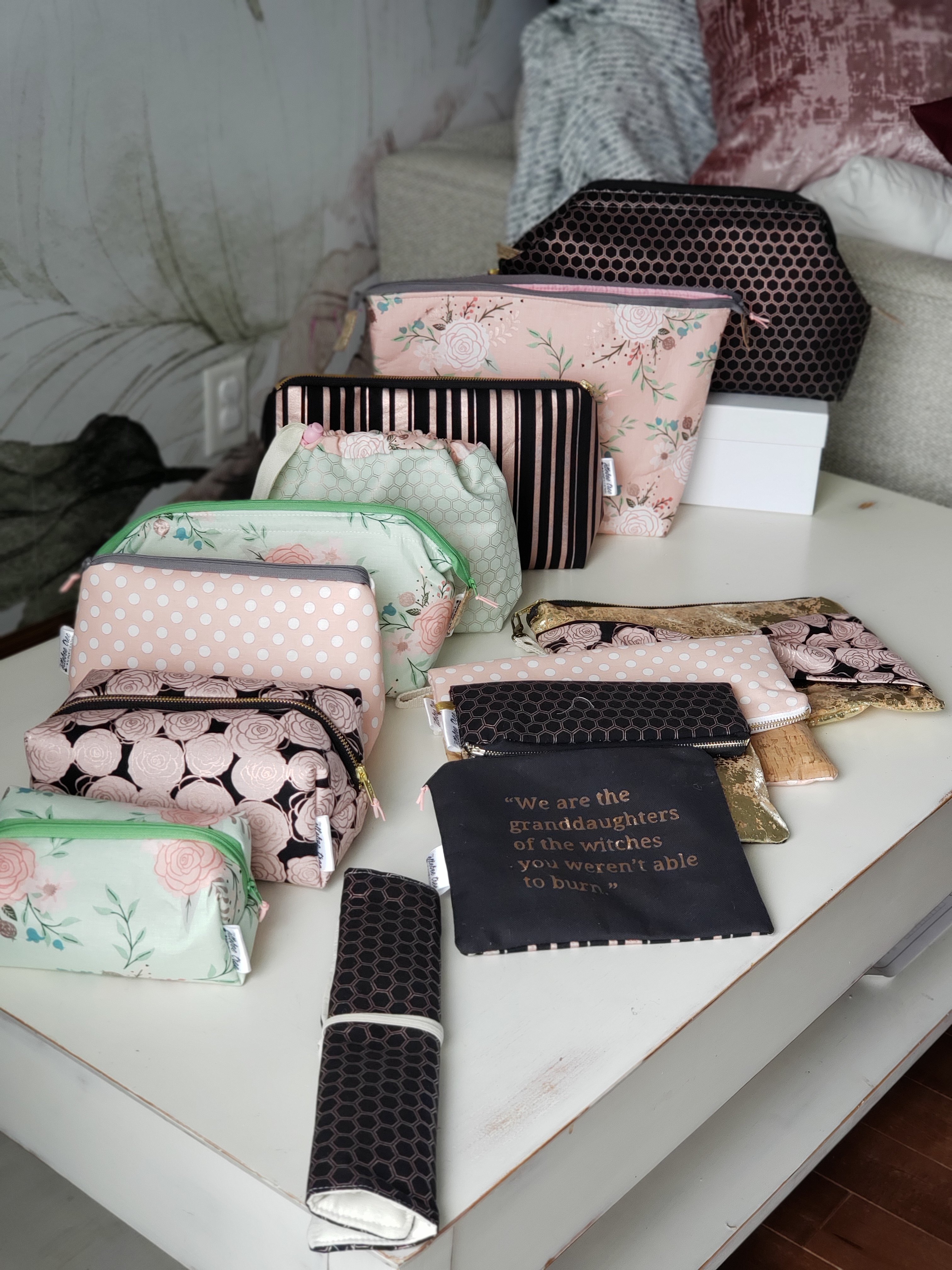 L: I am going to regret admitting this , but I kind of enjoyed making masks. Hear me out. It was fun making something different AND I was able to explore more seasonal fabrics which was new and fun for me last year. Believe it or not Halloween toiletry bags are not a big seller, so I found it inspiring to look at fabric differently. Now, in all honesty, of my mainstay products: Long live the Medium Retreat bag. I will never not love making it. I love the vintage take , with the wireframe and “doctor’s bag” feel, the function of the spillproof lining, the size and shape of it shows off the fabric beautifully, great lines and overall size. Not to mention I always feel really proud of myself for being able to make something so professional. It is also a piece that reminds me of the joy in perseverance. I vowed never to make one again after making it for the first time because it was so awful, but stuck to it because I knew it could be something great and now it is my most favorite style to offer.