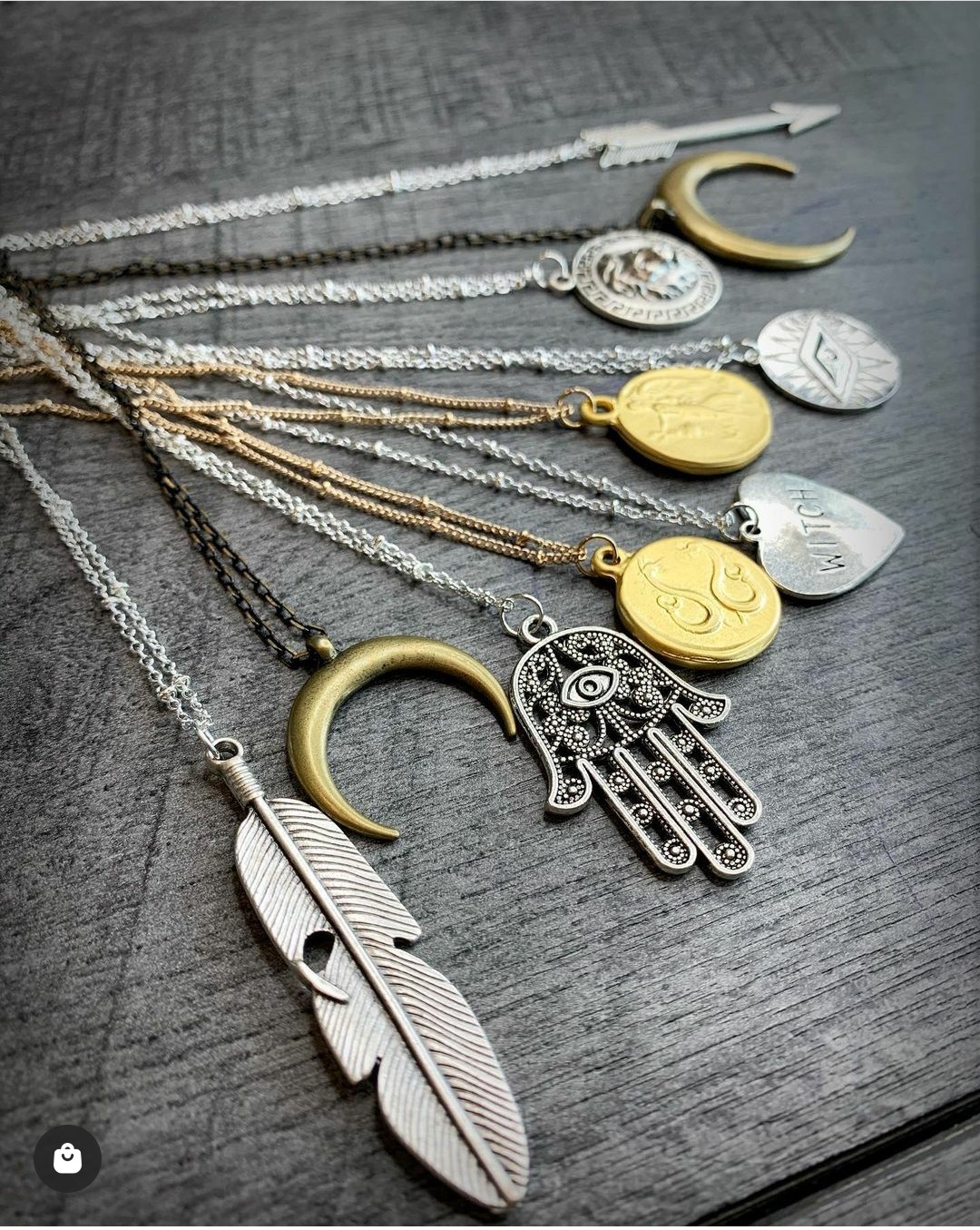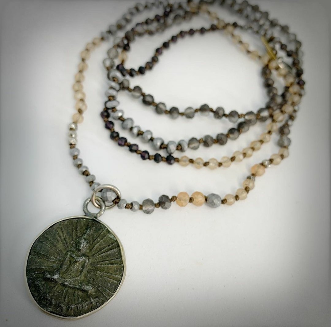 A: I design 2 main collections per year for Fall and Spring, then 2 mini collections for Summer and Holiday. The design process actually starts about 4-5 months before the release. I start to look at inspiration online, and pieces for my personal style, and slowly start to “collect” pendants, beads and chains that I love and the design process starts in my mind. After those months of collecting and designing, I usually spend about a week doing the actual creation process (FYI, my fave times of the year). It’s the moment I get to sit in that really fires me up. My passion gets to come alive. I have many sides to me, so whether its spiritually inspired, mom inspired, or dress up inspired, I usually end up with pieces for all of my moods…. which generally ends up a collection of pieces that most women can connect with to some extent.