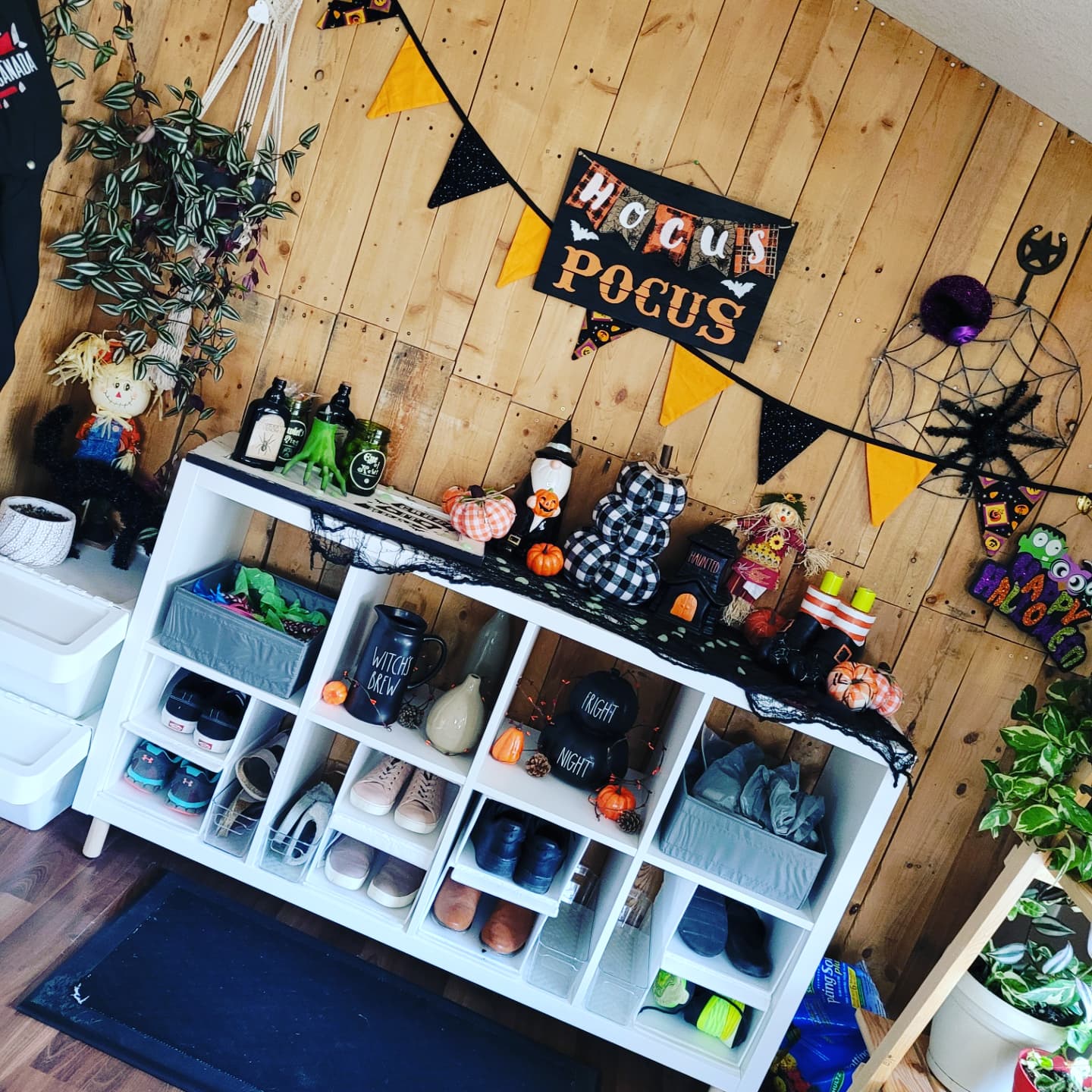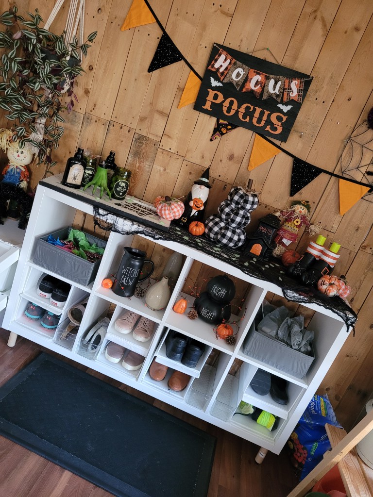 For my third one I repeated all the same steps but instead of the big bins I placed 2 shoe organizers in each bottom cubby and a clear organizer. On the top 4 I placed on each end a Grey organizer I had left over from organizing my drawers. In one I put all the dog leashes, doggie bags and brushes and in the other was filled with our water shoes and a bag of small hand sanitizer bottles for use as needed. The middle two and the top I decorated with Halloween Halloween decor and soon Christmas decor. It adds such a cool look to my mudroom against my pallet wall I did years ago.