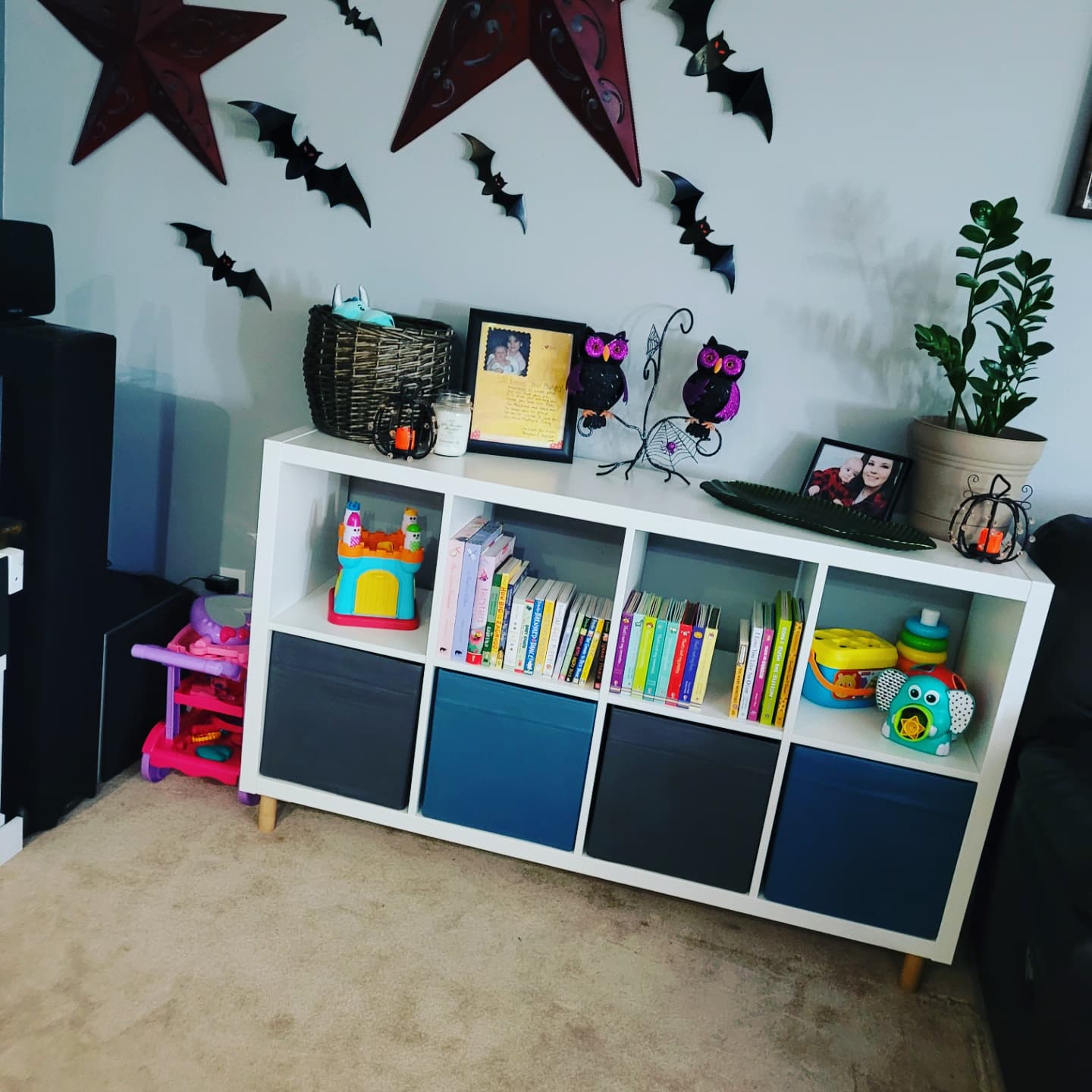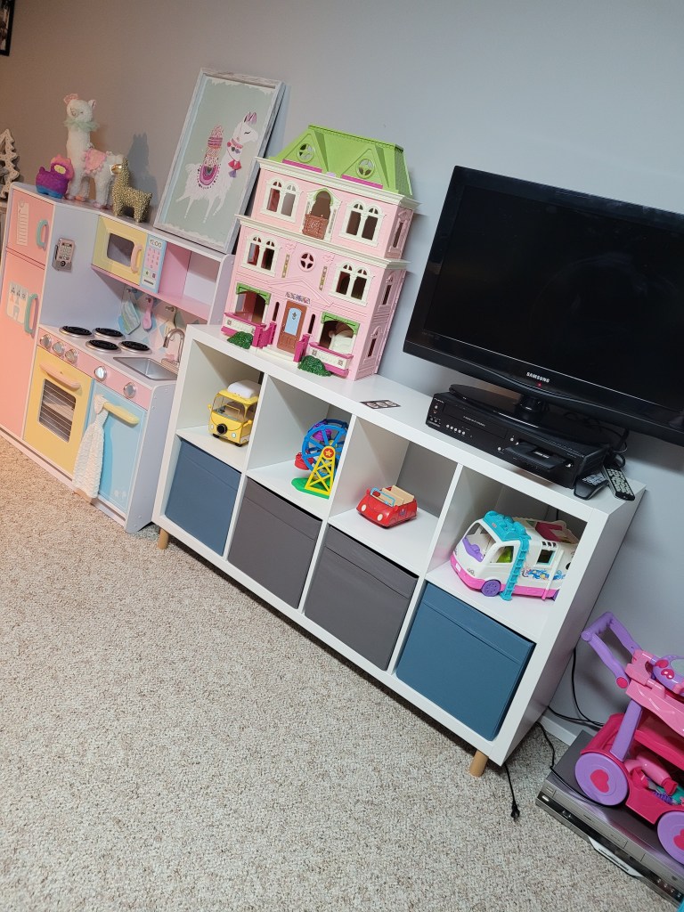 Attaching the legs wasn’t too difficult. I didn’t predrill holes, but you totally can for a bit more ease. Once I had it completed, I stood it up on the legs, moved it into place and added 4 bins on the 4 bottom cubby spots. 2 Grey and 2 blue if you care lol and I filled those with loose toys like blocks, furniture for the doll house, accessories etc. The top 4 spaces I filled with toys and books as well. Upstairs you can see I decorated the top for Halloween and placed pictures, decor to match my aesthetic while downstairs I put the dollhouse on top so it’s out of the way when not in use and a TV with a VCR/ DVD combo underneath so Miss Aliyah can enjoy the movies that her mom grew up watching as well.