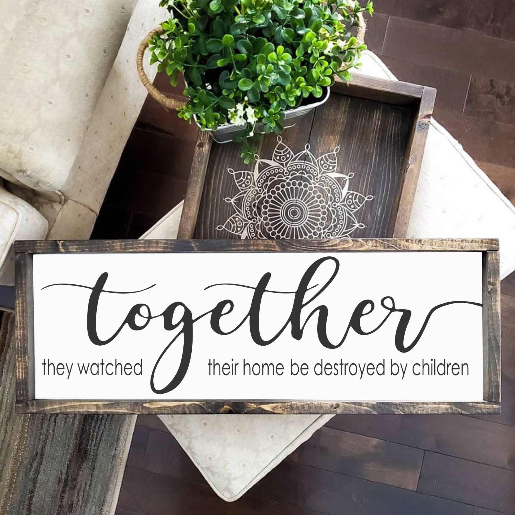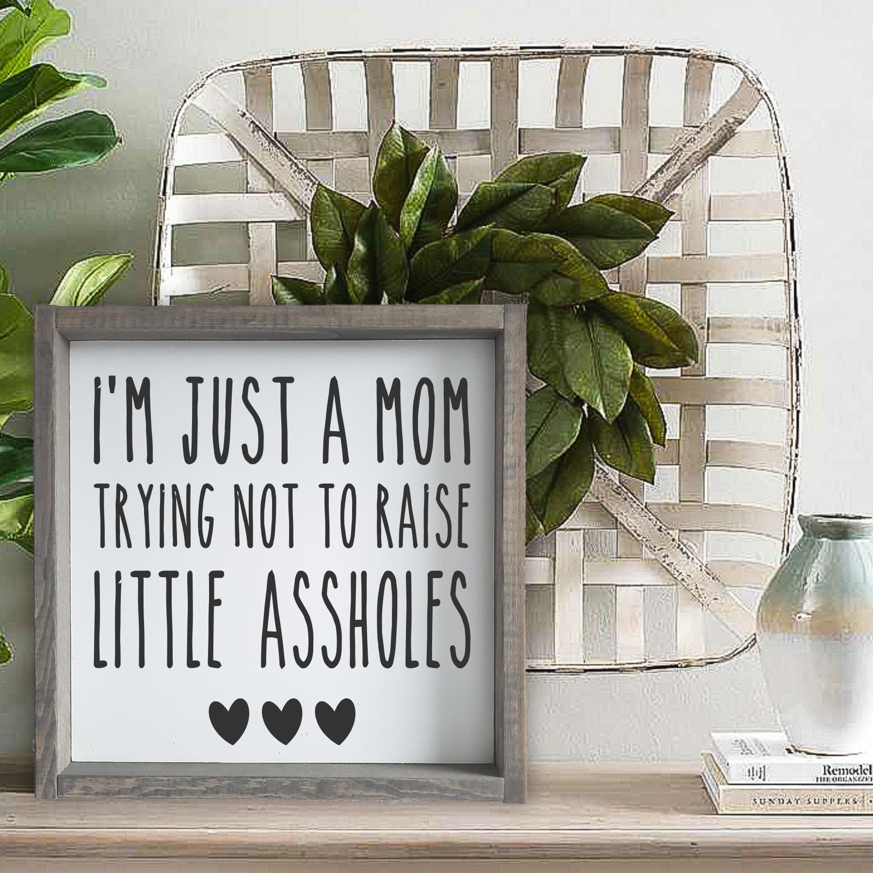 L: It all started 6.5 years ago when I was planning my daughter’s 3rd birthday party. Frozen was the theme to have but there were no decorations to be found anywhere. I ended up making everything from cut out characters to a large cardboard ice castle. It was pretty epic!! When all was said and done, I didnt want to toss out the decorations so I decided to post them on a local FB Auction page to see if I could get $25 for the whole lot. Well holy crap !! It blew up! Bidding went like crazy and the messages came pouring in about making other sets etc. This is where Lines by Lacey started. It went from hand drawn cardboard character cutouts to handpainted wooden cutouts to woodworking to lovey dovey signs to finally doing what feeds my soul- Snarky, sarcastic, real life humor signs.